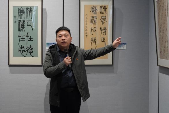 随后,师生党员在郭洪豹的讲解下,集体走进“诗画南航,清风廉韵”艺术作品展,沉浸式观“廉”。本次展览是第六届“清廉南航”宣传教育周重点活动,由学校纪委办主办,艺术学院、离退休处、天目湖校区联合承办,集中展出我校师生原创作品80余件,展品聚焦廉洁主题,以笔墨丹青传递清廉价值、弘扬正气新风。郭洪豹为大家详细介绍了展出作品的创作背景、艺术手法与廉洁文化内核,同志们驻足观赏、交流感悟,每一幅翰墨佳作都成为鲜活的廉洁教育教材,让工会干部与师生党员在审美熏陶中深化廉洁文化认同。